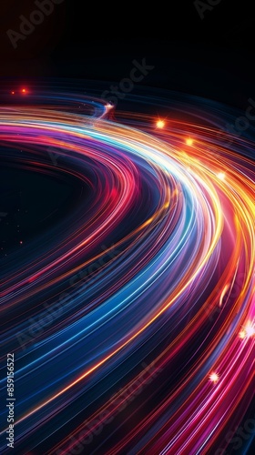Neon light trails on a dark background, abstract motion. Futuristic and technology concept