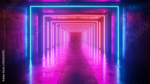 Neon Lights Illuminate a Dark Corridor with a Reflective Floor