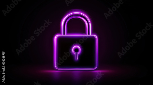 Neon lock symbol glowing in purple against dark background, representing security