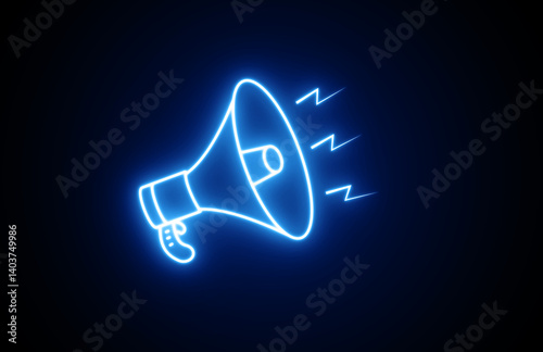 Neon megaphone icon. Glowing neon speaker sign, outline loudspeaker pictogram. Glowing neon line Blue color Megaphone icon isolated on black background.
