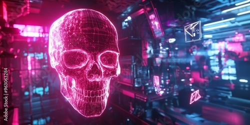 Neon pink skull in digital space.