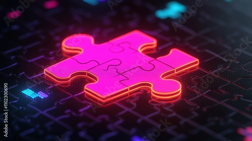 Neon Puzzle Piece on Abstract Digital Background in Vibrant Colors