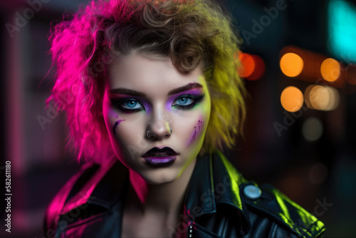 Neon rebel with a punk rock attitude and bold makeup, set against a gritty and urban cityscape, generative ai