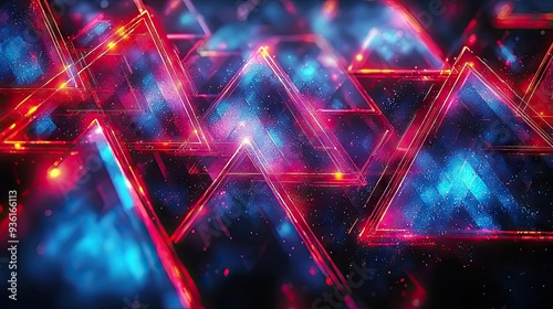 Neon red and blue geometric shapes on black base glowing particles light effects background, particles, shapes, blue, base, light, geometric, black background