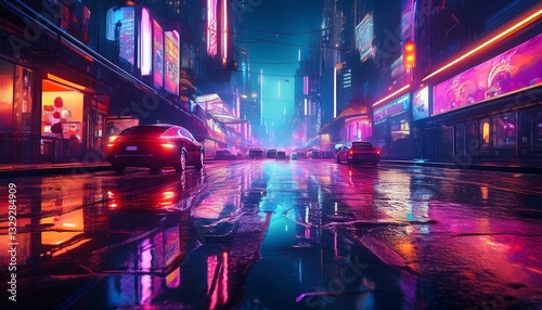 Neon reflections on rain-soaked asphalt in a futuristic metropolis, creating a mesmerizing, glowing cityscape with vibrant colors and a cyberpunk atmosphere.