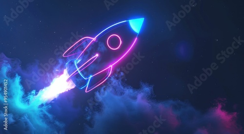 Neon rocket launching into space with colorful smoke against a dark starry backdrop