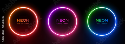 Neon round light. Circle frame with glow on a black background. Led ring gradient orange-red, purple-pink and green-blue colors. 3d laser electric portal. Vector template border for design with text.
