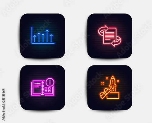 Neon set of Instruction info, Marketing and Growth chart icons. Innovation sign. Project, Article, Upper arrows. Crowdfunding. Neon icons. Glowing light banners. Vector