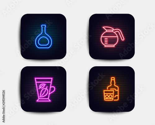 Neon set of Mint leaves, Cognac bottle and Coffeepot icons. Whiskey glass sign. Mentha leaf, Brandy alcohol, Brewed coffee. Scotch drink. Neon icons. Glowing light banners. Vector
