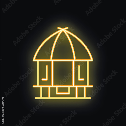 Neon sign of a classic round and empty bird cage glowing yellow on a black background