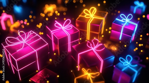 Neon silhouettes of overflowing gift boxes with neon light trails on black background.
