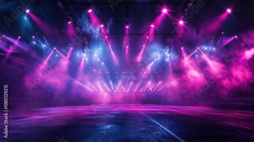 Neon spotlights shining in a stadium arena filled with smoky atmosphere and dynamic energy