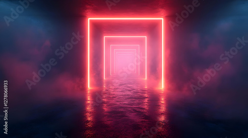 Neon Square Tunnel with Red and Blue Light on Dark Reflective Floor
