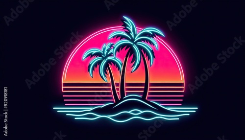 Neon sunset scene with palm trees and ocean Retro tropical landscape Synthwave style Circle frame Digital art Beach silhouette