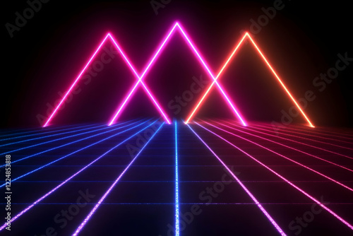 Neon Triangles Shine Brightly on a Gridded Surface in a Dark Background.