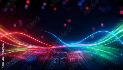 Neon Wave abstract background, Isolated on a dark background, colorful Neon wave with glow, Technology, network, internet concept, Copyspace with empty table
