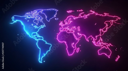 Neon world map with glowing electric blue and magenta outlines on dark background