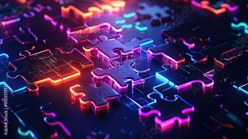 Neon-colored puzzle pieces assembling on a glowing platform, representing efficient API integration and technology systems