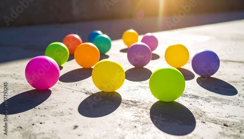 Neon-colored rubber balls bouncing on a sunlit concrete surface, casting crisp round shadows with motion blur