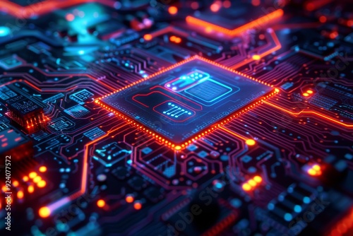 Neon-Lit Digital Circuit: A close-up view of a digital circuit board illuminated with neon lights, highlighting connectivity and innovation.