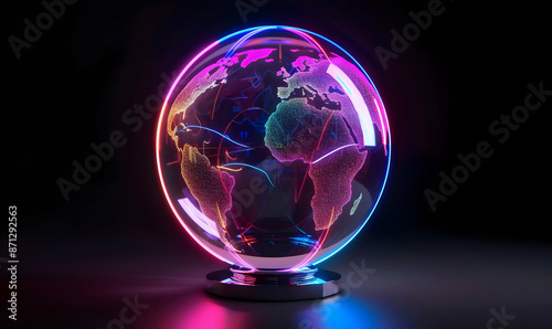 Neon-lit globe with a modern and futuristic design, representing global connectivity and technology in a vibrant, dark setting.