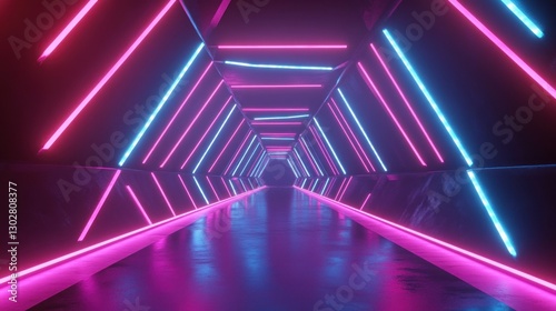 Neon-lit tunnel with vibrant pink and blue lights creating a futuristic atmosphere