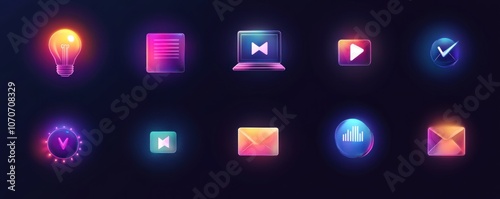 Neon-style icons for ideas, files, communication, and analytics on a dark background.