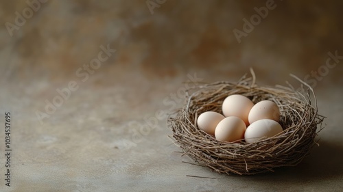 Nest of brown eggs on rustic background