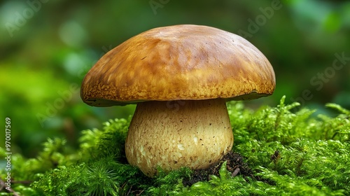 Nestled amidst verdant moss, Boletus Edulis, a prized forest delicacy, basks in the sunlight. Its golden-brown cap and sturdy stalk create a captivating sight against the lush backdrop