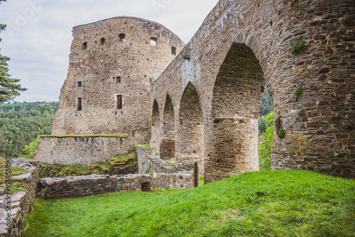 Nestled in the scenic landscape of Czechia, Velhartice Castle features a stunning Gothic bridge that connects ancient stone structures.