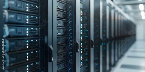Network connecting servers and storage systems in a data center room. Concept Data Center Networking, Server Connectivity, Storage Integration, Network Infrastructure, Data Center Management