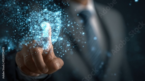 Network cybersecurity and privacy using artificial intelligence to safeguard data. AI technology is being used by a businessman to protect data management and information to cyberattacks.