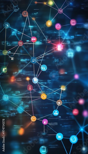 Network diagram illustrating interconnected business elements analysis, service, teamwork, tech