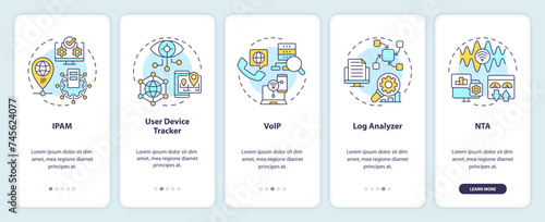 Network management software onboarding mobile app screen. Walkthrough 5 steps editable graphic instructions with linear concepts. UI, UX, GUI template. Myriad Pro-Bold, Regular fonts used