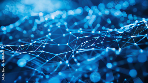 Network of blue lines and dots against a blue background represents digital technology, data, communication, and scientific concepts.