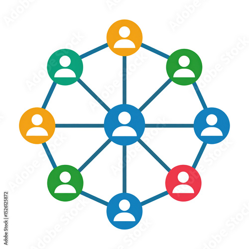 Network of interconnected multicolored user icons representing social connections and collaboration on a white background