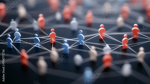 Network of small abstract figures connected by lines, representing data flow, digital communication, and teamwork in a futuristic concept art style