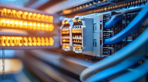 Network switch with ethernet cables connected. Cloud computing concept, wireless connection. Data transfer, internet, information technology. Technology, communication, networking, data center