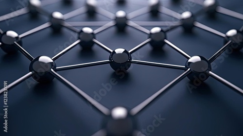 Networking event concept. Detailed close-up of interconnected metallic spheres and lines representing a network.