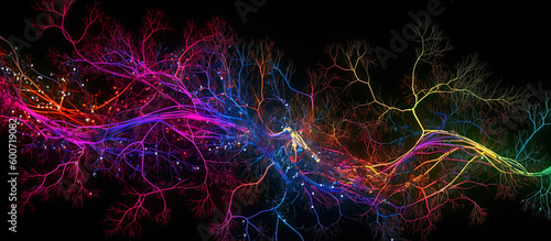 Neural cells with a light pulse on a dark background. Generative AI Illustration. Panoramic, horizontal background.