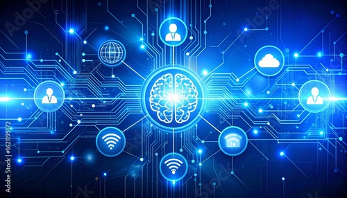 Neural Network Global Connectivity AI Brain Digital Ecosystem Blue Circuit Board.