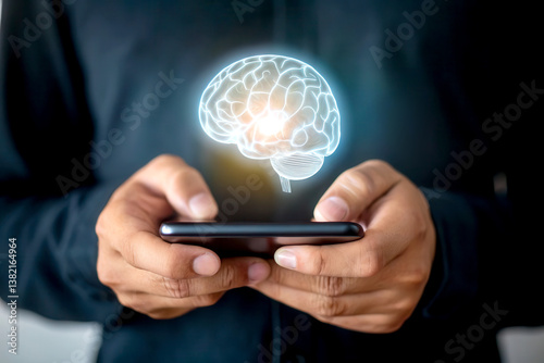 Neuro marketing concept. Innovative concept of a person using a smartphone with a glowing brain graphic above it.