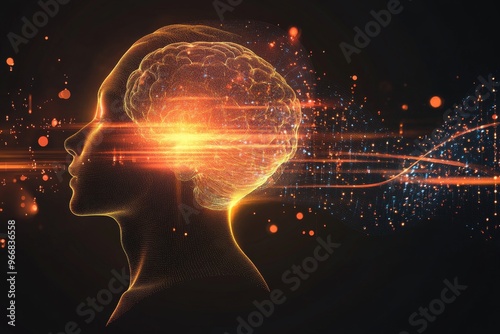 Neurocognitive mapping quantum neurofeedback and memory modulation side profile of a silhouette with neural lines and data waves symbolizing thought processing and digital flow