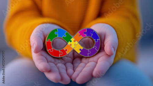 Neurodivergent child grasping infinity symbol constructed from vibrant puzzle pieces, symbolizing autism spectrum diversity and inclusivity
