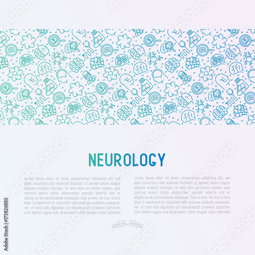 Neurology concept with thin line icons: brain, neuron, neural connections, neurologist, magnifier. Vector illustration for medical survey or report with place for text.