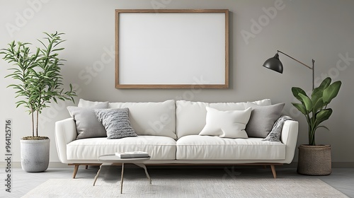 Neutral Sofa with Oversized Frame A neutral-toned sofa sits in front of an oversized empty picture frame, taking up most of the wall space, adding a bold statement to an otherwise simple room.