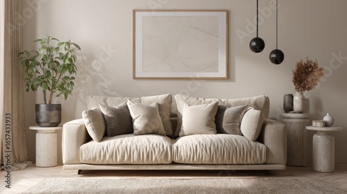 Neutral-toned interior with ISO A frame mockup hanging above a beige sofa, minimalist side tables, luxury styling, 3D render with textured base