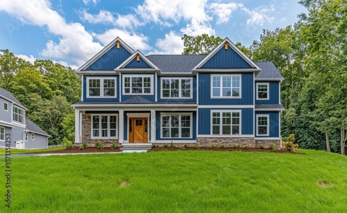 New construction home in Washington state with blue exterior walls and white trim, featuring large windows on the front of each room, lush green grass at its base, surrounded by trees and oth
