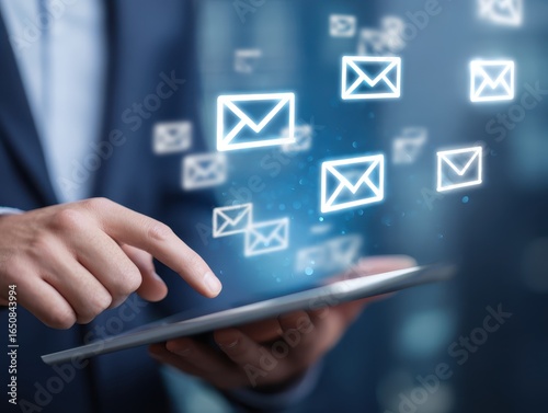 New email notification alerts concept for Digital marketing business communication through virtual inbox and internet technology as Business people use tablet with emails on a virtual screen