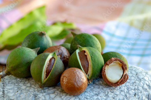 New harvest of ripe fresh Australian macadamia nuts in shell with leaves